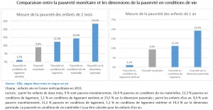 Combating childhood poverty is currently a national policy priority in France. This study highlights the necessity of establishing criteria other than household income to identify children living in difficult conditions. Implementing and measuring new indicators would help produce better adapted public policies that would more fully take into account the complexity and multidimensional nature of child poverty.