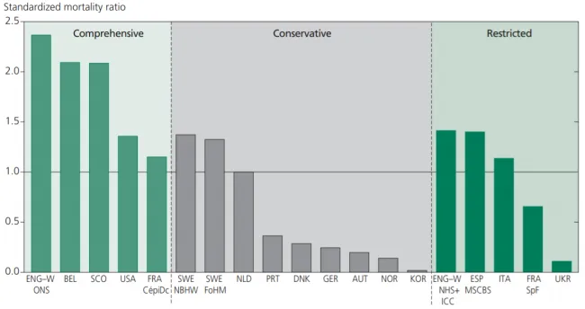 Note: Indirect standardization using the Netherlands as reference. From left to right: ENG-W ONS = England and Wales (Office of National Statistics); BEL = Belgium, SCO = Scotland; USA = United States of America; FRA CépDC = France (Centre d’Épidemologie sur les Causes Medicales de Décès); SWE NBHW = Sweden (National Board of Health and Welfare); SWE FoHM = Sweden (Public Health Agency); NLD = Netherlands; PRT = Portugal; DNK = Denmark; DEI = Germany; AUT = Austria; NOR = Norway; KOR = South Korea; ENW NHS+ICC = England (National Health Service) and Wales (Public Health Wales); ESP MSCBS = Spain (Ministry of Health, Consumer Affairs, and Social Welfare); ITA = Italy; FRA SpF : France (Santé Publique France); UKR = Ukraine.