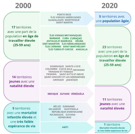 Source: Maurice Bilionière, Zinaïda Salibekyan-Rosain, Gwenaëlle Taupe, Didier Breton, Arnaud Régnier-Loilier, 2024, En 2020, les Antilles françaises et la Guyane se situent aux deux extrémités des dynamiques démographiques caribéennes