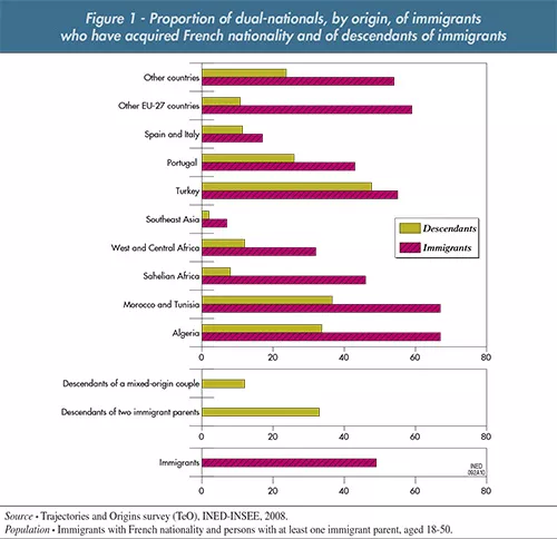 Source: Patrick Simon, «Nationality and National Sentiment» in Cris Beauchemin, Christelle Hamel et Patrick Simon (Coord.), Trajectories and Origines. Survey on Population Diversity in France. Initial Findings, Documents de travail n°168, Ined, 2010