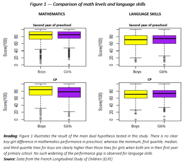 Until recently, debate has centered on whether the observed difference in math performance by sex is innate or societally induced. It is difficult to argue today that it has an entirely innate origin, first because mathematics is fundamentally symbolic and abstract and therefore inaccessible to babies and very young children; second, because when very young children are tested in non-symbolic mathematics, no advantage for boys is observed. It is therefore reasonable to conclude that there is no boy-girl gap before the age of 3 or 4, and to look for its appearance between the ages of 4 and 7. Recent ELFE data has enabled researchers to study the gap—both its presence and possible emergence—across that age range, and so to produce unprecedented research work in this area.
