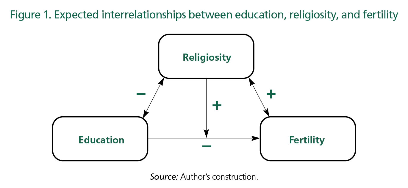 What happens to fertility when high educational attainment is combined with religiosity? Which of the two has the stronger effect on fertility? In other words, at comparable education levels, does religious affiliation moderate the education effect, leading to women without religion having lower fertility than religiously affiliated women? The expected interrelationships between the three are schematized below.