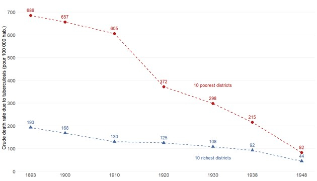 Those inequalities were at their widest just before the First World War, when mortality in the ten poorest Paris neighborhoods was four times that in the city’s ten richest ones. By the end of the Second World War these inequalities had greatly receded (Figure 4).