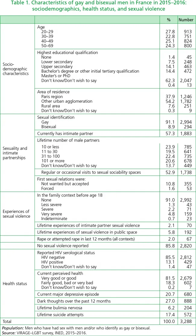 | About the data The French Institute for Demographic Studies (INED) launched the Violence and Gender Relations survey, VIRAGE, in 2015 to measure gender-related violence in France. To include gender and sexual minorities, a supplementary survey entitled VIRAGE-LGBT was conducted between November 2015 and March 2016. Respondents for this survey were recruited by way of sexual minority group associations and websites, and the survey was conducted on line. Of the 10,612 initial participants, 7,148 completed the questionnaire—a response rate of 67%. The survey was presented as a study of ordinary aspects of LGBT life and included questions on respondents’ sociodemographic characteristics and violent acts undergone. |