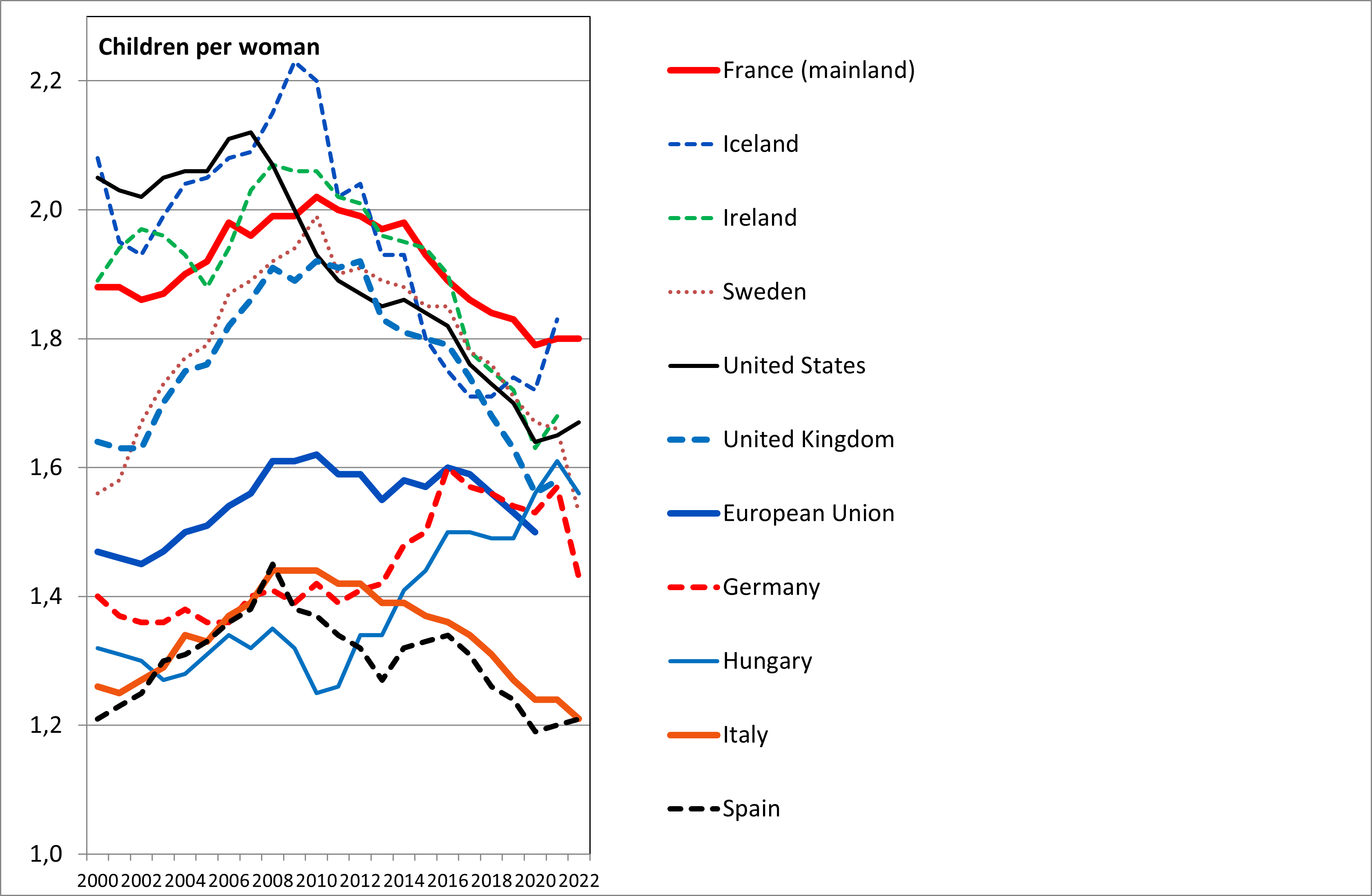 [8'56''00] Despite the fact that a fall in fertility of approximately 7% was observed in early 2023 compared to the same months in 2022, fertility in France is not that low, and the decrease is not sharp. We may yet reach a level on the order of 1.7 children per woman for 2023—significantly higher than in other European countries. And the decrease may not persist.
