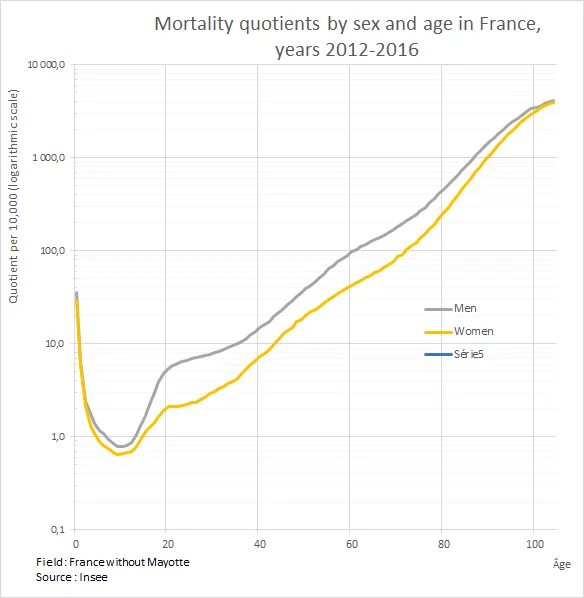 The probabilities of dying vary between 0 and 1 for each individual, and are presented here "per 10,000" population. As variations with age are enormous (from 1 death per 10,000 at age 10 to 1 per 10 at age 85) a logarithmic scale is used. The vertical distance expresses the ratio (and not the difference) between the two values. For example, the y-coordinates 1 and 10 are the same distance apart as 10 and 100.