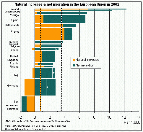 This graph shows natural population increase and net migration in the EU-15 countries in 2002.