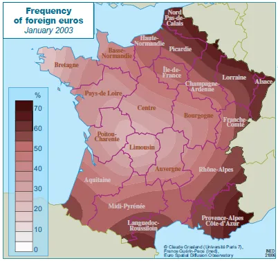 The euro was introduced in January 2002. Each country mints its own identifiable coins, but they are legal tender throughout the euro zone. They thus serve as a marker of human movements, travelling in small quantities in the pockets and purses of their users. French people who travel to another euro-zone country take away French euros and bring back foreign ones, and foreigners visiting or passing through France do likewise. The foreign euros brought into France then circulate from person to person. The frequency of foreign euro coins thus indicates the frequency of movements to or from other euro-zone countries.