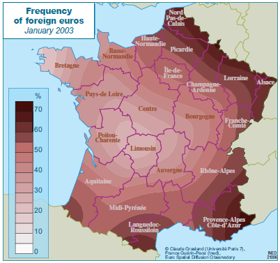 « Mobilité européenne, tourisme et diffusion des pièces euros étrangères en France » (C. Grasland, F. Guérin-Pace, Revue d'Economie régionale et Urbaine, 2004, n°5, pp 793-822.)