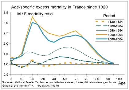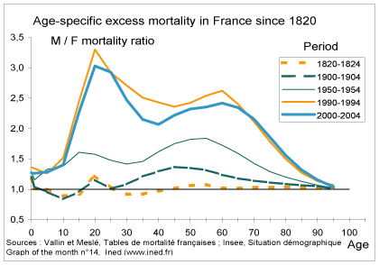 Excess male mortality is measured as the male/female ratio of the probability of dying at a given age, for different groups of years from the early 19th century to the early 21st century: 1820-1824, 1900-1904, 1950-1954, 1990-1994 and 2000-2004.
