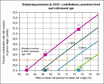 Point A represents the French Pensions Advisory Council's baseline scenario which is based on the new rules laid down in 2003, on current demographic trends and on specific economic assumptions. To achieve equilibrium in 2020, it provides for an increase in retirement age, a reduction of the pension/wages ratio to 67% and a 1.5 point increase in contribution rates. The line BC gives the range of possible combinations of contributions increases and reductions in the pension/wage ratio if retirement age is not increased any further.