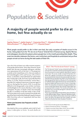 Most people would prefer to die in their own bed, but in fact only a quarter of deaths occur in the home. The “Fin de vie en France” [End of life in France] survey follows the residential and medical trajectories of patients up to their death. In cases of non-sudden death, 45% of persons are living at home four weeks before they die. The most frequent pattern is a move from home to hospital before death (30%); just 14% remain at home throughout the last month of life. A transfer back home from hospital is much less frequent (2%). The complexity of treatment often makes home care unfeasible, so a hospital transfer is inevitable. This is the reason most frequently given for not respecting the patient’s wish to die at home.