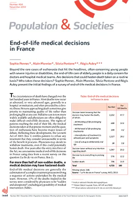 In France, almost half of deaths (48% in 2010) are preceded by a medical decision that may hasten death. But only in 1% of cases are drugs administered to deliberately end life. The large majority of decisions taken are based on the provisions of the Leonetti Act, which enables physicians, under specific circumstances,to withhold or withdraw treatment or to administer drugs in order to alleviate pain or symptoms that may have the effect of hastening death. However, the legal provisions governing these decisions are still not always fully known or complied with: end-of-life decisions are not always discussed with the patients and medical teams, and very few patients draw up advance directives, as recommended in the Leonetti Act, to express their wishes to the physicians responsible for their care.