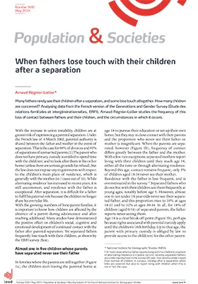 According to the 2005 ERFI survey, almost one in ten under-age children whose parents are separated never see their father. The younger the child at the time of parental separation, the less frequently he or she subsequently sees his father. The proportion of children who never see their father is high when the divorce was not by mutual consent but initiated by either the mother or the father only. It is also higher when the father has a low level of education, has an unstable job or is unemployed, or has a low income. Loss of contact between father and child is less frequent in cases of alternating residence.