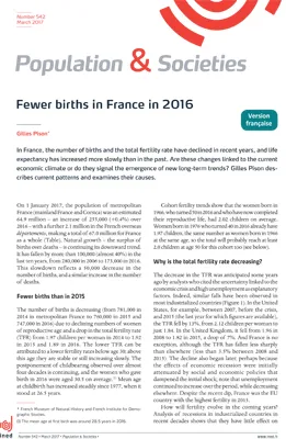 The number of births fell by 4.5% in France between 2014 and 2016 due to declining numbers of women of reproductive age and a decrease in the total fertility rate (TFR) from 1.97 children per woman in 2014 to 1.89 in 2016. Similar decreases in TFR have occurred in most developed countries, but the drop in France is smaller and occurred later than elsewhere thanks to social and family policies which dampened the impact of the crisis.