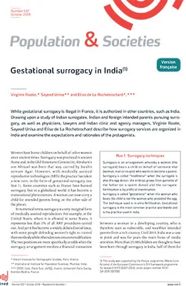 Surrogacy is a highly controversial practice both in France and across the world. Little is known, however, about the representations and experiences of the people involved. A study of physicians, intended parents and surrogates conducted in India reveals a complex reality, simultaneously described as a "win-win” solution and as a difficult choice with some inherent risks. Following recent political changes in India, surrogacy is now only available to Indian