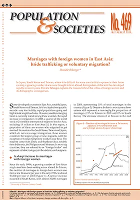 A growing number of East Asian men marry a bride from a foreign country. In the late 2000s, marriages in which the wives were of foreign origin accounted for 15% of new unions in Taiwan, 8% in South Korea and 6% in Japan. The largest group of immigrant spouses in these countries come from the People's Republic of China. Vietnamese women are the second largest group of immigrant spouses in South Korea and Taiwan, and likewise for Filippino women in Japan.The quest for spouses abroad stems from the difficulties encountered by men in their own countries. Women are increasingly unwilling to accept the traditional role of wife and mother, with an unequal division of tasks between spouses and, in many cases, the obligation to leave their job.