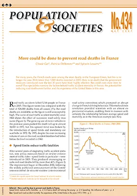 In France, traffic accident mortality peaked at 18,000 deaths in 1972 before falling back quite steadily to just 5,500 deaths in 2005 as successive road safety measures were introduced. Among the various factors behind this fall, the introduction of speed limits and mandatory seat belts (1972) followed by a stricter enforcement policy from 2003 played a decisive role. The recent decrease in average speed has also reduced the number of road deaths.