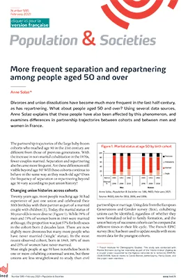 In France, among individuals born in the 1930s, only 4% of men and only 5% of women lived in a union several times by age 50. Most have experienced only one cohabiting union, usually marriage, in their lifetime. Among those born 30 years later, in the 1960s, a quarter of both men and women have experienced more than two unions. Men are more likely to repartner than women at any age. These gender gaps widen with age. Men are a quarter more likely than women to form a new relationship at age 50, and 3 times more likely at age 73. Divorces among seniors are increasing.