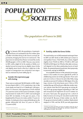 On 1st January 2003, the population of metropolitan France was estimated to be 59.6 million, plus a further 1.8 million living in the French overseas departments, bringing the total to 61.4 million [1]. The population in metropolitan France increased by nearly 290,000 people (+ 0.5%) in 2002. This was very similar to 2001, with a slight fall in the surplus of births over deaths (natural increase) due to slightly fewer births and slightly more deaths offset by a slight rise in the surplus of immigration over emigration (net migration) as estimated by Insee