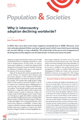 In the early 2000s there were around 40,000 intercountry child adoptions worldwide, most of them concentrated in a few countries of origin (China and Russia) and a handful of receiving countries (headed by the United States). Between 2004 and 2013, the number fell by two-thirds in France and throughout the world. The shortage of adoptable children is due to a decline in the number of orphaned or abandoned children and an increase in domestic adoptions in countries of origin, but also to a range of political measures to eradicate child trafficking through stricter controls on intercountry adoption. Most of the children available for international adoption now have “special needs”.