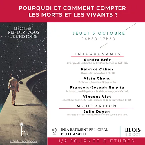 Le Jeudi 5 octobre, l'Ined coorganise une demi-journée intitulée " Pourquoi et comment compter les morts et les vivants ?" avec la participation de Fabrice Cahen (Ined), avec la société de démographie historique (SDH) et le Comité d'histoire de la Sécurité sociale (CHSS) (de 14h30 à 17h30 à l'INSA, bâtiment principal, petit amphithéâtre, Blois).