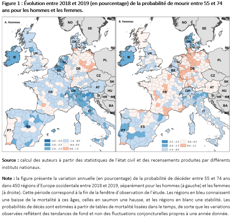 L’analyse des taux de mortalité par âge révèle que cette fracture s’explique principalement par l’évolution de la mortalité entre 55 et 74 ans. Dans les années 1990, la mortalité à cet âge reculait rapidement. Mais cela n’est plus le cas depuis les années 2000, et dans certaines régions, le risque de mourir entre 55 et 74 ans a même commencé à réaugmenter. C’est notamment le cas de la plupart des départements du pourtour méditerranéen français et d’une grande partie de l’Allemagne pour les femmes (Figure 1) entre 2018 et 2019, dernières années de l’étude. Ces âges intermédiaires concentrent un grand nombre de décès : une stagnation ou une hausse de la mortalité à ces âges suffit à briser la dynamique d’ensemble.