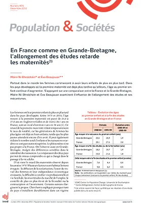 Les femmes ont leur premier enfant de plus en plus tard dans les pays développés. L'âge moyen à la première maternité a ainsi reculé d'environ 4 ans en Angleterre- Galles et en France depuis le milieu des années 1970. La diffusion de la scolarisation et l'allongement des études sont parmi les premiers facteurs évoqués pour expliquer ce retard. Dans les deux pays, l'âge de fin d'études et la première naissance ont de fait subi presque le même recul. L'intervalle qui sépare la fin des études de la première naissance s'est accru seulement d'une demi-année en 15 ans entre 1980-1984 et 1995-1999. Le lien entre les deux tendances apparaît bien quand on mesure la fécondité non plus selon l'âge des femmes mais selon la durée écoulée depuis la fin des études. Si le retard de la première naissance tient d'abord au prolongement des études, ce sont aussi les femmes les plus diplômées qui ont le plus retardé la première naissance après la fin des études.