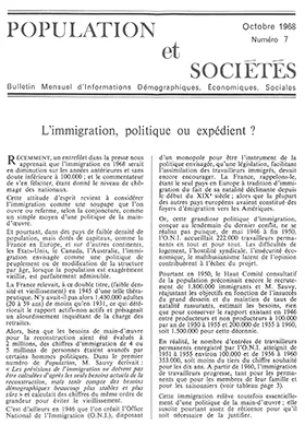 Récemment, un entrefilet dans la presse nous apprenait que l'immigration, en 1968, serait en diminution sur les années antérieures et sans doute inférieure à 100 000; et le commentateur de s'en féliciter, étant donné le niveau de chômage des nationaux.