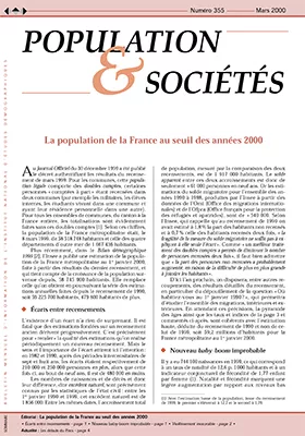 Plus récemment, dans le Bilan démographique 1999 [2], l'Insee a publié une estimation de la population de la France métropolitaine au 1er janvier 2000, faite à partir des résultats du dernier recensement, et qui tient compte de la croissance de la population survenue depuis, 58 745 900 habitants. Elle remplace celle qu'on obtient en poursuivant la série des estimations annuelles faites depuis le recensement de 1990, soit 59 225 700 habitants, 479 800 habitants de plus.