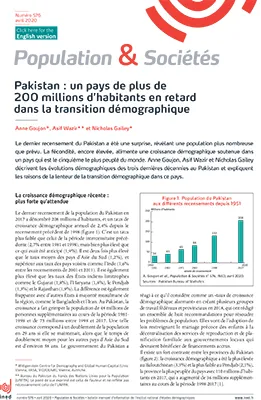 Le Pakistan comptait 208 millions d’habitants en 2017 d’après le dernier recensement de sa population. Celle-ci s’est accrue de 2,4% par an depuis le recensement précédent de 1998. Le pays connaît une transition démographique plus lente que la plupart de ses voisins d’Asie. L’indice synthétique de fécondité (ISF) y est plus élevé, 3,6 enfants par femme en moyenne en 2017, et y baisse plus lentement.