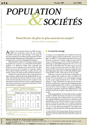 Au dernier recensement français de 1999, la quasi-totalité des personnes ayant 60 ans ou plus n'avaient connu qu'un seul mariage. à ces âges, les divorces comme les nouvelles unions sont rares et l'événement le plus fréquent qui vient modifier la situation conjugale est la mort du compagnon de toujours.