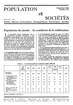 La possibilité d'unssatbilisation de la population mondiale commence à être considérée sérieusement. Une telle éventualité oblige, en raison de l'inertie des phénomènes démographiques, à repousser les horizons habituels (à20 ou 50 ans) des projections de population et à porter le regard jusqu'à la fin du siècle prochain.