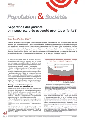 La séparation est à l’origine d’une baisse de niveau de vie marquée pour les enfants, et d’une dégradation générale de leurs conditions de vie, en particulier quand ils vivent avec leur mère seule. Le risque d’entrée en pauvreté s’en trouve accru. Les taux de pauvreté des enfants l’année de la séparation sont bien plus élevés (29 %) que ceux des enfants vivant avec leurs deux parents (13 %). Cet écart reste marqué les années suivantes. Plus les enfants connaissent la séparation de leurs parents à des âges jeunes, plus le risque de pauvreté est important. Certains enfants, en résidence alternée, ne sont pauvres qu’avec un de leurs parents (plus souvent la mère), tandis que d’autres sont pauvres chez leurs deux parents.