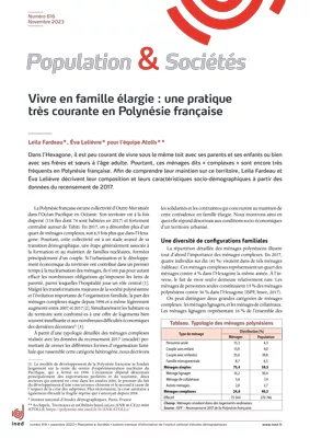 Dans l’Hexagone, il est peu courant de vivre sous le même toit avec ses parents et ses enfants ou bien avec ses frères et sœurs à l’âge adulte. Pourtant, ces ménages dits « complexes » sont encore très fréquents en Polynésie française. Afin de comprendre leur maintien sur ce territoire, Leïla Fardeau et Éva Lelièvre décrivent leur composition et leurs caractéristiques socio-démographiques à partir des données du recensement de 2017.