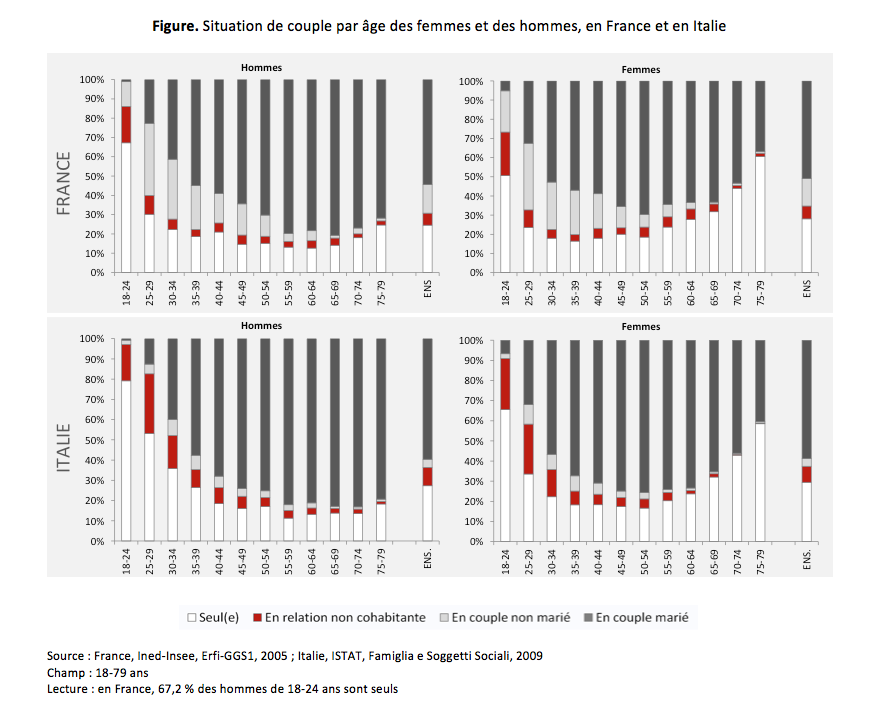 Source : Arnaud Régnier-Loilier, Daniele Vignoli, 2018, "The diverse nature of living apart together relationships: an Italy–France comparison", Journal of Population Research, mars 2018, Volume 35, Issue 1, pp 1–22.