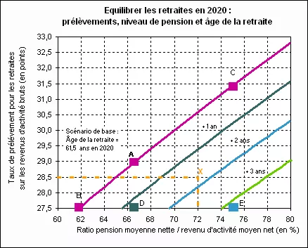 Le point A indique le scénario de base du Conseil d'orientation des retraites fondé sur les nouvelles règles posées en 2003, les évolutions démographiques et des hypothèses économiques spécifiques. Il prévoit, pour atteindre l'équilibre en 2020, une augmentation de l'âge effectif de la retraite jusqu'à 61,5 ans, ainsi qu'une diminution du ratio pensions/salaires à 67 % et une hausse des prélèvements de 1,5 point. Sans modifier davantage l'âge de la retraite, la droite BC résume les arbitrages possibles entre hausse des prélèvements et baisse du ratio pensions/salaires. Une hausse de l'âge de retraite conduit à d'autres scénarios. Une hausse supplémentaire de trois ans est nécessaire pour maintenir inchangés les autres paramètres. Le point E décrit ainsi un ratio pensions/salaires constant à 75 %, un taux de prélèvement constant à 27,5 points et un âge effectif de la retraite de 64,5 ans en 2020 pour maintenir l’équilibre. Toutes les solutions intermédiaires sont possibles (points X ou D par exemple).