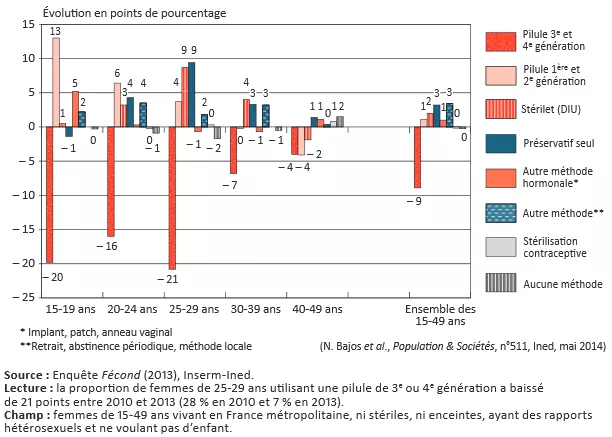 Entre 2010 et 2013, le recours à la contraception orale est passé de 50 % à 41 % chez les femmes de 15-49 ans (parmi celles concernées par la contraception). Ce recul est dû à la baisse des pilules incriminées : leur usage est passé de 19 % à 10 % en trois ans. Mais les femmes ne se sont pas beaucoup reportées vers les pilules de 2e génération (23 % d’utilisatrices contre 22 % en 2010), ce qui suggère une désaffection vis-à-vis de la pilule en général. La baisse est particulièrement marquée chez les jeunes femmes de moins de 30 ans. Les jeunes femmes de 25-29 ans en particulier se sont davantage tournées vers le stérilet ou le préservatif.