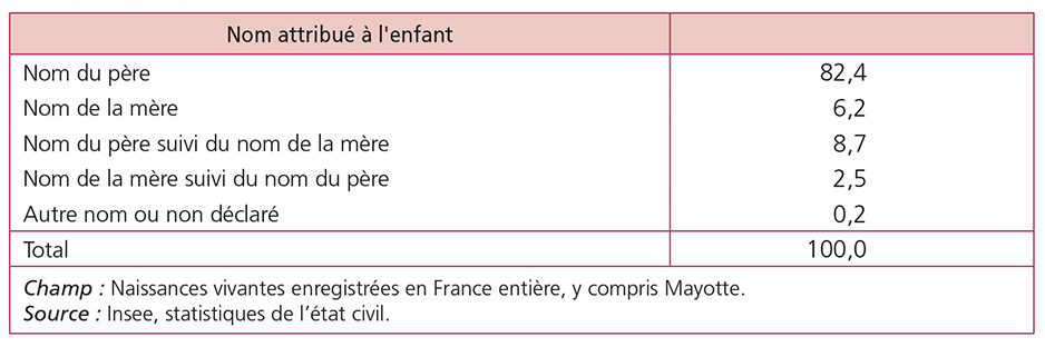 Depuis l’année 2005, année d’entrée en vigueur de la réforme du nom de famille, les parents peuvent transmettre leurs deux noms à leurs enfants, grâce à une procédure d’enregistrement du choix du nom à l’état civil (Mazuy et al., 2015, 2016). En 2017, un peu plus de 11 % des enfants se sont vu attribuer le double nom. Ce choix, dont se saisissent une minorité de couples, et qui peut paraître égalitaire du fait qu’il met en avant la double filiation, reste toutefois empreint des usages traditionnels : le nom du père se trouve en première position huit fois sur dix. Ces pratiques ont peu évolué depuis le début des années 2010.