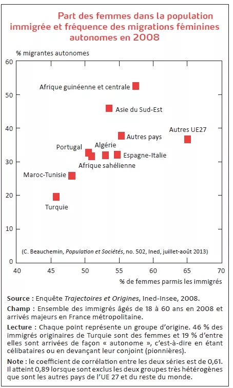 Source : Cris Beauchemin, Catherine Borrel, Corinne Régnard, « Les immigrés en France : en majorité des femmes », Ined, Population & Sociétés n° 502, juillet-août 2013