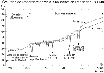 La progression de la durée de vie moyenne a été interrompue par les conflits (guerres napoléoniennes, guerres de 1870, 1914-1918 et 1939-1945) qui ont entraîné des reculs importants. Mais ils n'ont duré que le temps du conflit.