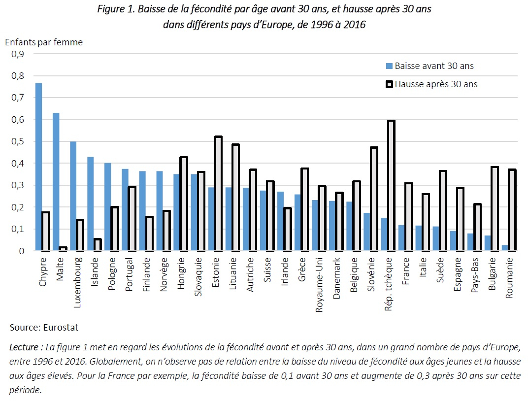 Dans les pays où la conciliation entre vie professionnelle et vie familiale est la plus difficile, il est observé à la fois moins de femmes actives et moins d’enfants : les femmes doivent choisir entre travailler et élever de jeunes enfants. Dans les pays où cette conciliation est moins difficile, les mères sont davantage actives et les femmes actives ont davantage d’enfants. À l’échelle des pays, les effets de contexte dominent les contraintes individuelles, notamment biologiques. Les évolutions de la fécondité dans les différents pays européens résultent des modalités rendant possible la naissance d’enfants aux âges élevés – telles que les dispositions pour favoriser la conciliation des vies professionnelle et familiale, plus que de la baisse de la fécondité aux âges jeunes ou que des contraintes biologiques de la reproduction. C’est pourquoi les politiques familiales et les conditions économiques conjoncturelles jouent un rôle majeur sur les niveaux de fécondité.
