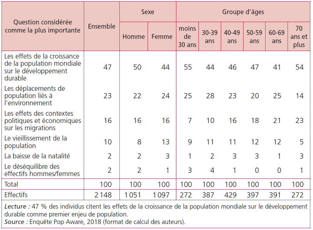 Les questions de population jugées les plus importantes (à partir d’une liste fermée de six propositions), par sexe et par groupe d’âges
