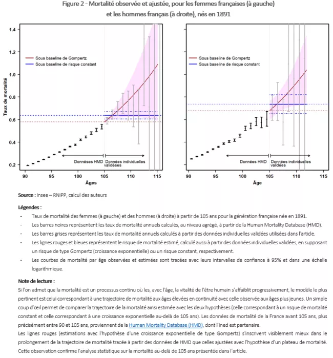 En 2016, des généticiens avaient publié un article dans Nature suggérant que la longévité humaine était limitée à 115 ans environ (Dong et al., 2016). Deux ans plus tard, en 2018, des démographes utilisant des données italiennes suggéraient au contraire dans Science qu’il n’y avait pas de limites formelles à la longévité (Barbi et al. 2018). Ils constataient des taux de mortalité essentiellement constants au-delà de 105 ans et soutenaient donc l’existence d’un « plateau de mortalité » à partir de cet âge chez les humains (figure 1). L’existence de ce plateau signifierait que, passés 105 ans, les taux de mortalité cessent de dépendre de l’âge et restent les mêmes quel que soit l’âge. Cela impliquerait qu’il n’y a pas de limites strictes à la longévité humaine, les valeurs les plus élevées observées ne dépendant que du nombre des personnes atteignant l’âge de ce plateau.