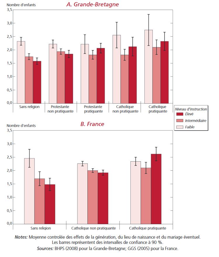 Toutefois il existe des différences dans le lien entre religiosité et niveau d’instruction en Grande-Bretagne et en France, la religion ayant moins d’impact en France. En Grande-Bretagne, il existe un fort gradient social dans la probabilité d’avoir un premier enfant pour les femmes sans religion alors qu’en France se déclarer sans religion est associé à des comportements de fécondité semblables quel que soit le niveau d’études. Ceci peut s’expliquer par la plus grande pression à avoir au moins un enfant et à un système social de prise en charge de la petite enfance plus favorable qui diminue le coût d’opportunité chez les femmes investissant davantage dans leur carrière professionnelle.
