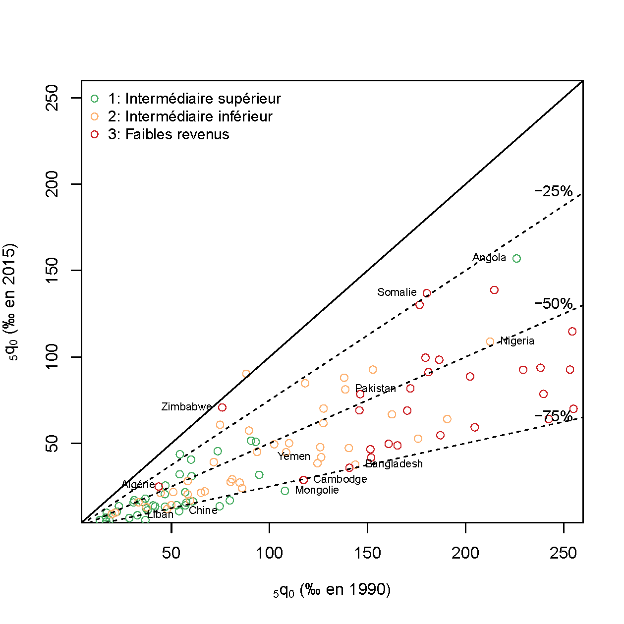 Évolution des quotients de mortalité infanto-juvénile entre 1990 et 2015 dans les 108 pays à faible et moyen revenu.