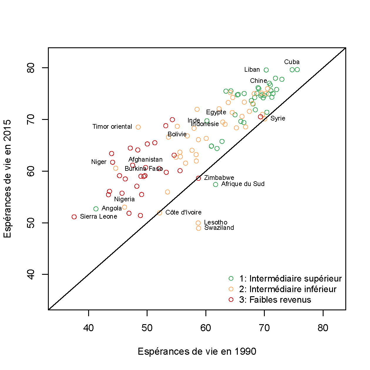 Évolution de l'espérance de vie à la naissance (sexes réunis) de 108 pays du Sud de 1990 à 2015, selon leur niveau de revenu.
