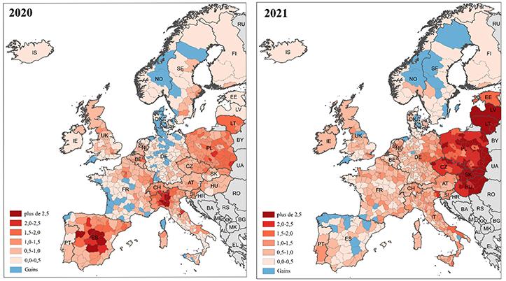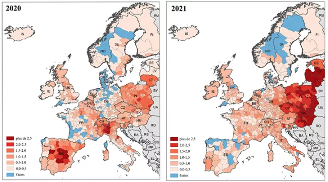 En 2021, la surmortalité s’est déplacée vers l’est de l’Europe. Les régions où les pertes d’espérance de vie ont été supérieures à deux ans se situaient en Pologne, en Tchéquie, en Hongrie, et en Slovaquie ; seules une région italienne et une espagnole faisaient partie de ce groupe, alors que ces deux pays avaient été fortement touchés en 2020. En Allemagne, un contraste marqué opposait l’est du pays très touché à l’ouest qui l’a été beaucoup moins. En France, les valeurs étaient plus homogènes qu’en 2020, avec des pertes d’espérance de vie globalement proches d’une année. Comme en 2020, la surmortalité en 2021 a été la plus élevée en Seine-Saint-Denis.