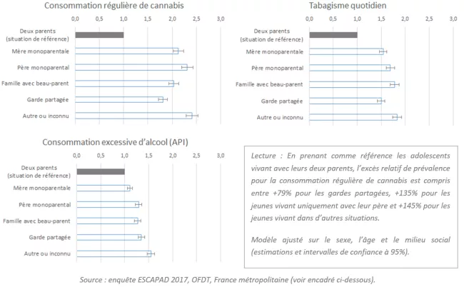 La transition de l’adolescence vers l’âge adulte est une étape importante dans la mise en place des comportements et modes de vie liés à la santé. Les résultats de cette étude montrent une forte association entre la consommation de ces substances à l’adolescence et la configuration familiale. Avoir vécu une reconfiguration familiale, ce qui est le cas des jeunes vivant en familles monoparentales ou en familles recomposées, est associé à une fréquence plus élevée des consommations de tabac, d’alcool et de cannabis. Cependant, cette corrélation ne signifie pas qu’il existe un rapport de causalité entre rupture parentale et consommation de ces substances. On peut en effet envisager que la consommation ait précédé le changement de configuration familiale, comme moyen pour l’adolescent de faire face aux conflits et au stress préalables, ou encore que dans la nouvelle configuration la surveillance parentale soit simplement moins étroite, favorisant les opportunités de consommer.