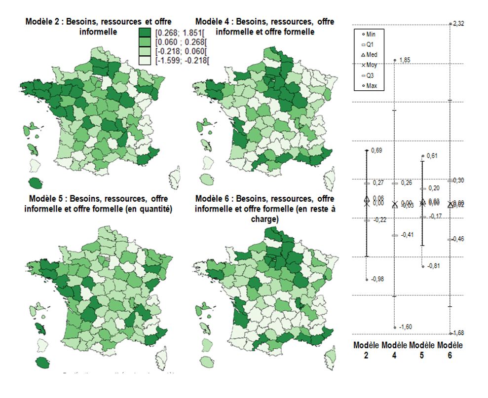 Grâce à une modélisation multiniveau (Bringe et Golaz, 2017), sont mis en commun les besoins, les ressources et l’offre de prise en charge pour expliquer les différences de recours à une prise en charge en établissement ou à domicile. L’analyse montre de larges inégalités territoriales de la probabilité de vivre en établissement (voir carte, modèle 2). Elles s’amoindrissent lorsqu’on tient compte de l’accessibilité géographique à l’offre formelle (modèle 5). A l’inverse, elles augmentent lorsqu’on tient compte de l’accessibilité financière : le RAC (modèle 6). L’offre formelle que ce soit en coût ou en quantité semble donc contraindre les choix des personnes âgées.